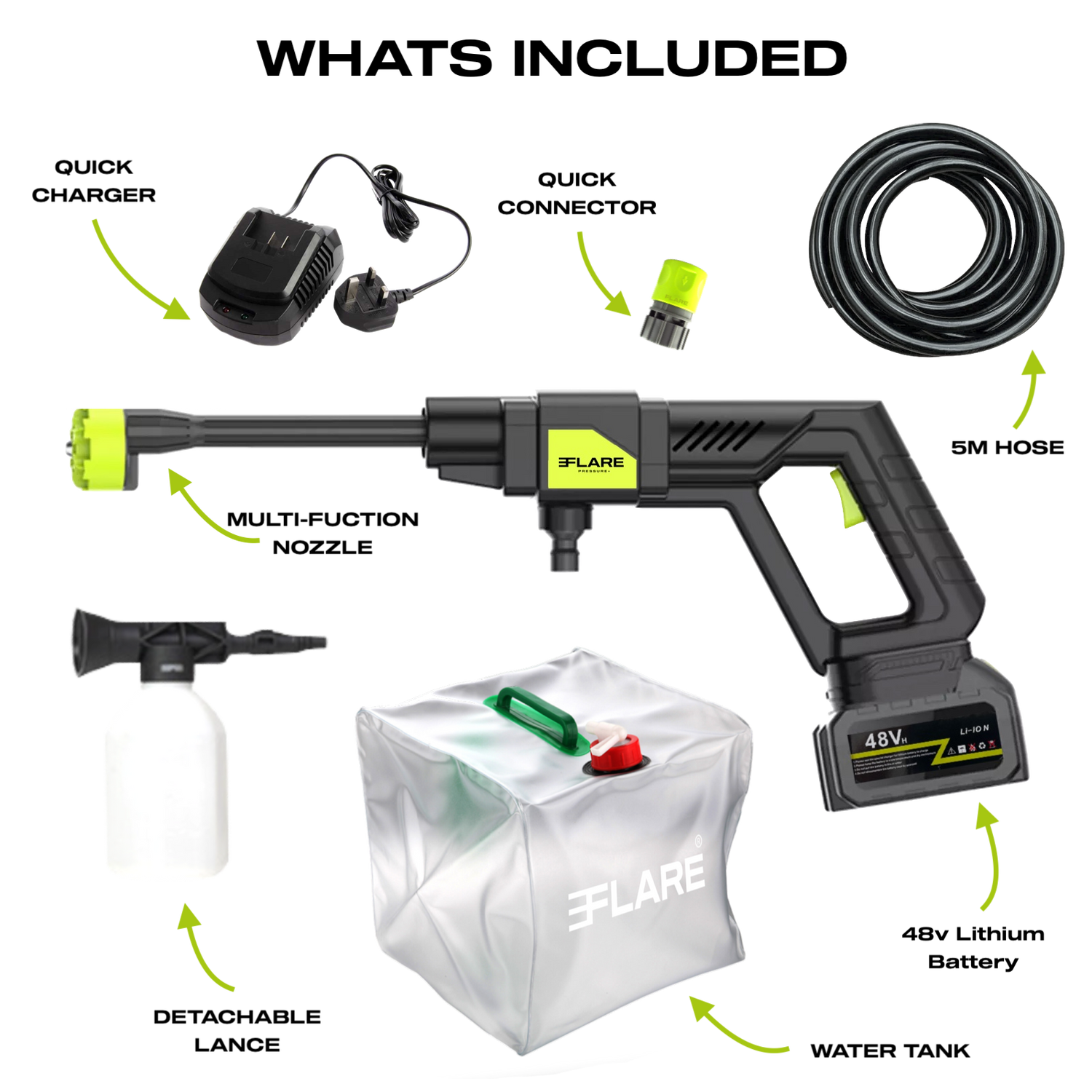 Powered by FLARE Renegade™️ pump technology, the device will remove even tough grime & dirt build ups with ease. Better still, it can complete a full vehicle with just 15-20L of water (coming from our included 20L collapsible FLARE water bag).